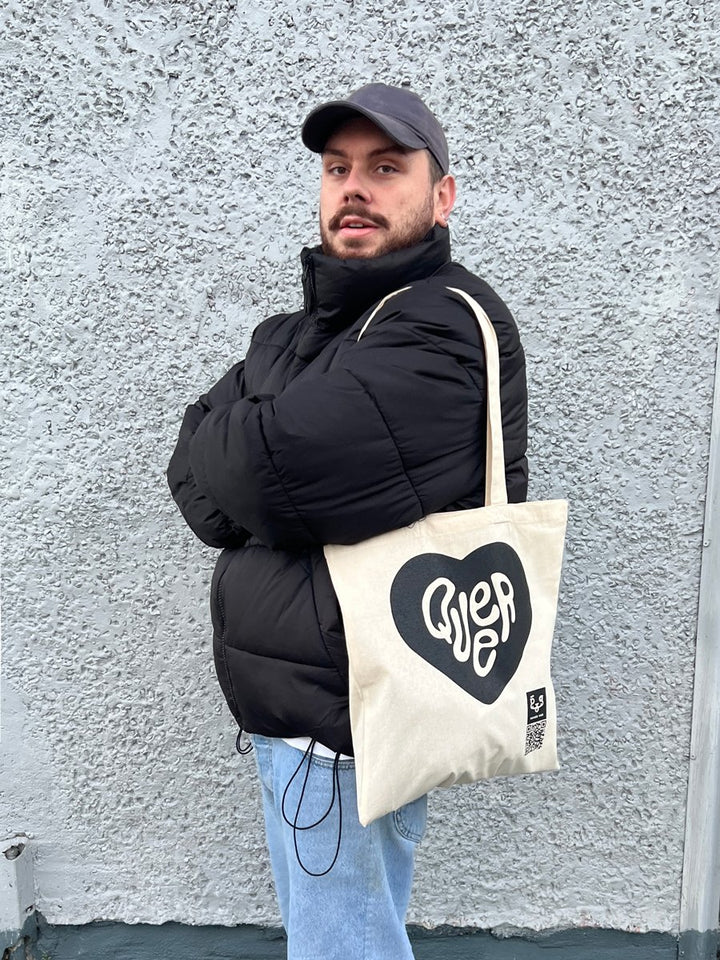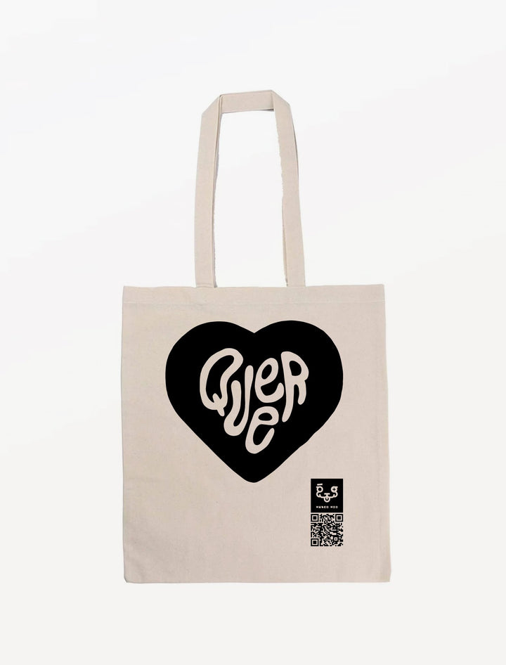 Natural silk screen printed cotton tote featuring AR enabled QUEER design. Scan the QR code on your phone camera and then locate the Heart design to unlock augmented reality queer chrome realness. Hope you enjoy and welcome to the Metaverse :B